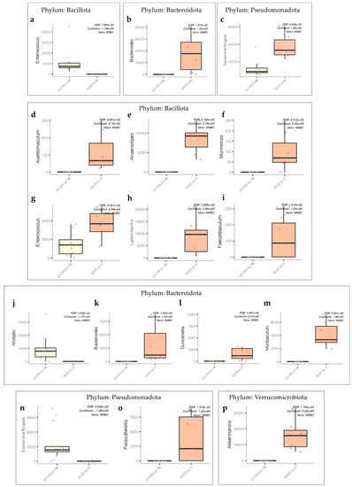 We further evaluated specific differential abundances of OTUs on the genus level between the two treatment groups by MaAsLin2 [57] in R package, with FDR adjustment value of 0.05. The abundance of Enterococcus from phylum Bacillota was significantly decreased, and Bacteroides from phylum Bacteroidota and Escherichia. Shigella from phylum Pseudomonadota was significantly enriched in the MNEC group compared to the MTERM group at two weeks of age (Figure 3a–c). MNEC mice had a significantly greater abundance of Acetitomaculum, Anaerostipes, Murimonas, Enterococcus, Ligilactobacillus, Faecalibaculum from phylum Bacillota; Bacteroides, Duncaniella, Muribaculum from phylum Bacteroidota; Parasutterella from phylum Pseudomonadota; and Akkermansia from phylum Verrucomicrobiota than MTERM mice at four weeks of age (Figure 3d–i,k–m,o,p). The abundance of Alistipes from phylum Bacteroidota and Escherichia.Shigella from phylum Pseudomonadota was significantly reduced in MNEC mice at four weeks of age (Figure 3j and Figure 3n, respectively). These data demonstrated that MNEC microbial communities were distinctly different from those of MTERM in α-diversity at two weeks of age, overall bacterial community composition, and specific taxonomic abundance levels at both two and four weeks of age.