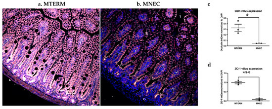 Because a dysfunctional intestinal barrier characterized by irregular tight junctions at the intercellular spaces of intestinal epithelial cells is a strong indicator of gut immaturity and is associated with microbial translocation from the gut as well as inflammatory responses [21,58,59], we investigated the effect of the two microbial communities used to colonize the host on the development of tight junctions in the distal small intestine (ilea), the area of the intestine classically affected by NEC. Using immunohistochemical analysis, we detected, when compared to MTERM mice (Figure 4a), a significantly lower surface expression of occludin and ZO-1 in MNEC mice (Figure 4b) (quantification in Figure 4c,d, both groups n = 3, p < 0.05, and p < 0.001, respectively) at two weeks of age.