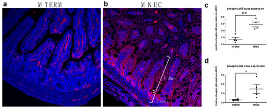 MNEC mice displayed increased crypt inflammation in the ileum at two weeks of age. Representative images of immunofluorescent labeling of phosphor-p65 (red) with DAPI (blue) to counter-staining the nuclei in MTERM (a) and MNEC (b) mice. There was a significantly increased phosphor-p65 in the crypt (c), but not the villus (d) in the ileal sections in the MNEC (n = 4) compared to those in the MTERM (n = 4) mice at two weeks of age. lmageJ (NIH) was used to quantify the co-localization of phosphor-p65 and nuclei. Blocks represent individual samples. Data is presented as mean ± S.E.M. ** indicates a significant difference when p-value is <0.01. ns, not significant.
