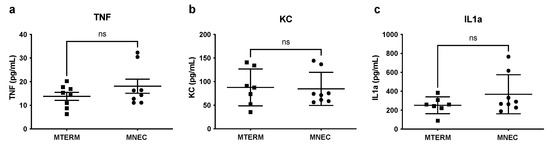 Because systemic inflammation is strongly elevated in NEC patients compared to the healthy controls [60], we evaluated the difference in systemic inflammation between MTERM and MNEC mice at two weeks of age. In two-week-old mice, the serum levels of TNF, KC, and IL-1α evaluated by multiplex ELISA were similar between MTERM and MNEC mice (Figure 6a–c, all p > 0.05, n = 7–8). There was also no difference in the levels of IL-6, IL-1β, MIPα, and IL-10 between the two groups.