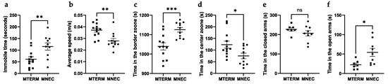 Locomotor and anxiety deficits in MNEC mice. MTERM mice were more mobile (a), traveled with faster speed (b), spent less time in the border zone (c), and spend more time in the center zone (d) (n = 12 for MTERM mice and n = 11 for MNEC mice) in the open field test at four weeks of age. MTERM mice (n = 7) were not different from MNEC (n = 9) mice in time spent in the closed arms in the elevated plus maze test (e). MTERM mice (n = 7) spent less time in the open arms than MNEC mice (n = 9) (f). Blocks and dots represent individual samples. Data is presented as mean ± S.E.M. *, **, and *** indicate significant differences when p-value is <0.05, <0.01, and <0.001, respectively. ns, not significant.