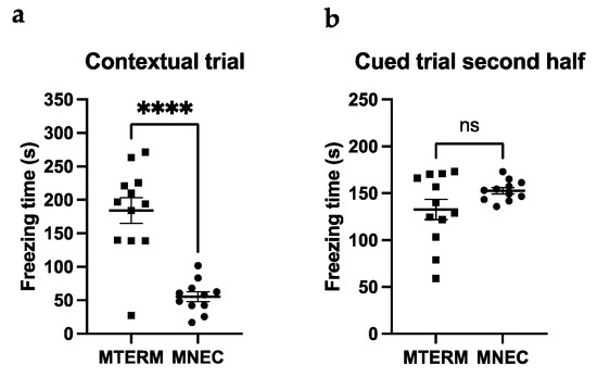 To investigate the effects of microbiota on associative learning and memory, MTERM and MNEC mice were subjected to the contextual/cued fear conditioning test. MTERM mice had significantly longer freezing times (184.2 ± 19.2 s) than MNEC mice (55.4 ± 7.4 s) at four weeks in the contextual fear conditioning (same environment as the conditioning session) (Figure 8a, p < 0.0001). No difference in freezing time in the second half of the cued fear conditioning test (changed environment and acoustic CS presentation) was found at four weeks of age (Figure 8b). These data demonstrated that mice colonized with microbial communities from preterm infants who went on to develop NEC acquired contextual memory impairment.