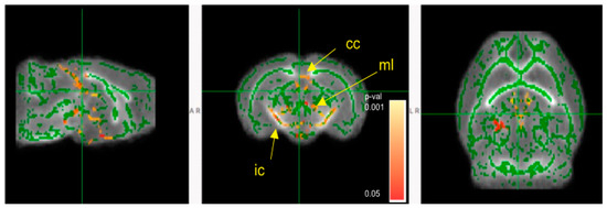 Decreased fractional anisotropy (FA) in MNEC mice relative to MTERM mice based on TBSS analysis. Green skeletonized white matter image was overlaid on mean group FA map, shown on sagittal coronal and horizontal sections. Red-orange pseudo-colored statistical parametric map of t-test p-values represent voxels where FA was significantly higher in MTERM mice (p corrected < 0.05). cc—corpus callosum, ic—internal capsule, ml—medial lemniscus. Animal numbers at four weeks of age (n = 5).