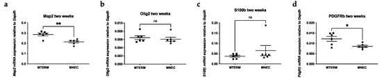 Relative brain transcripts of Map2 ((a), n = 6 for both groups at two weeks of age), Olig2 (b), S100b (c), and Pdgfr (d) were measured by RT-PCR. Data is presented as mean ± S.E.M. and normalized to Gapdh mRNA transcript levels, Blocks and dots represent individual samples. ns, not significant. * and ** indicate significant differences when p-value is <0.05 and <0.01, respectively.