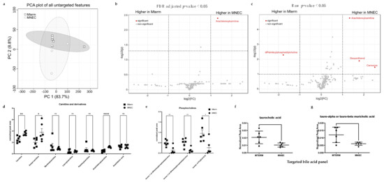 Brain metabolic profiles of MTERM and MNEC mice (a) principal component analysis (PCA) plot showed there was no separation between the two groups (both n = 6). (b) Volcano plot showing relative abundance of putatively identified features according to GNPS with FDR-adjusted p values. (c) Volcano plot showing relative abundance of putatively identified features according to GNPS without FDR-adjusted p values. In both (b,c) plots, the X-axis represents the abundance fold change on log2 scale, and the Y-axis represents the negative log10 of the calculated p value. (d) Reltive abundance of the analyzed features with putative IDs of carnitine analogs between the two groups. (e) Relative abundance of the analyzed features with putative IDs of phosphocholine analogs between the two groups. Targeted metabolic profiling revealed relative abundance levels of (f) Taurocholic and (g) tauro-alpha or tauro-betamuricholic arid from the bile acid panel were significantly lower in the brain samples of NEC mice. MetaboAnalyst was used to generate the plots and statistics. *, **, and **** indicate significant differences when p-value is <0.05, <0.01, and <0.0001, respectively. ns, not significant. Blocks and dots represent individual samples.