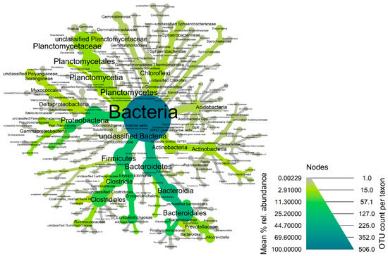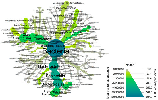 Heat-tree of the core fecal microbiota of coyotes in the Texas panhandle. Node and line widths increase with increasing OTU counts while increasing green color indicates increasing mean % relative abundance of the core taxonomic groups.
