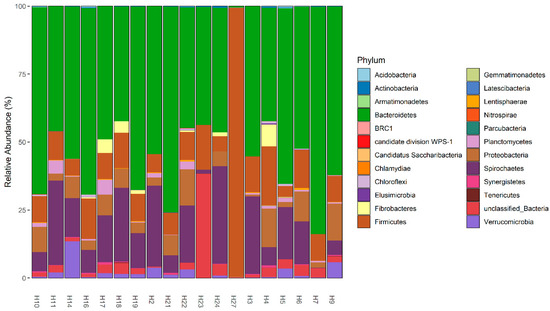 Phyla level relative abundances of fecal microbiome in 19 wild hog samples.