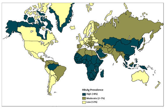 Three epidemiological patterns of HBV infection have been established according to the prevalence of HBsAg in general population: low endemicity (<2%; the United States of America (USA), Canada, Western Europe and some countries of South America), intermediate (2–7%; Middle East, Eastern Europe, Alaska, Greenland, Pacific Islands, Central America and South America) and high (≥8%; China, sub-Saharan Africa and the Amazon basin, among other regions) [6,12]. The variations in HBV endemicity are also frequently correlated with the predominant mode of transmission (Figure 1).