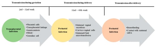 Perinatal transmission is the most frequent route (30–40%) of vertical transmission. This mechanism is defined as infant contagion at the time of birth as a result of exposure to maternal vaginal secretions, epithelium cells and micro transfusion of maternal and fetal blood [66].