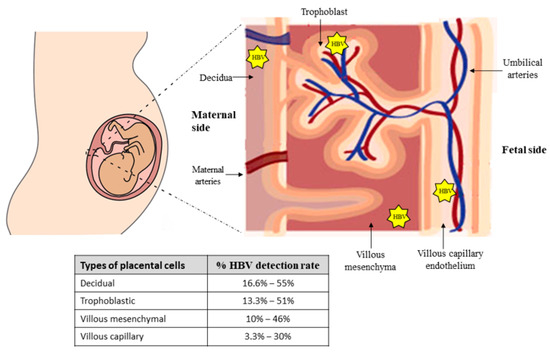 Some studies have shown the ability of the virus to translocate through the placenta to the fetal trophoblast [10,50,51]. Thus, Chen et al. examined viral infection in 157 placental tissues obtained from infected pregnant women by detection of HBV DNA with PCR and in situ hybridization techniques and detection of HBsAg and HBcAg by immunohistochemistry assay. The HBV infection rate was higher in decidua cells (55.4%; 87/157) and in trophoblastic cells (51.0%; 80/157); compared with villous mesenchymal cells (46.5%; 73/157) and villous capillary endothelial cells (29.9%; 47/157) (p < 0.01) [10]. Similar results were reported by Xu et al [50]. In this study, the HBV infection rates on the 101 placenta samples (HBsAg, HBcAg or viral DNA) were 40.6% in trophoblastic cells, 36.6% in villous mesenchymal cells (37/101) and 18.8% in villous capillary endothelial cells. Both studies demonstrated that the HBV infection rate gradually decreases in the maternal-to-fetal placental layer. Therefore, HBV could cross the placental barrier, thus infecting and replicating in all types of placental cells before it reaches the fetus (Figure 3).