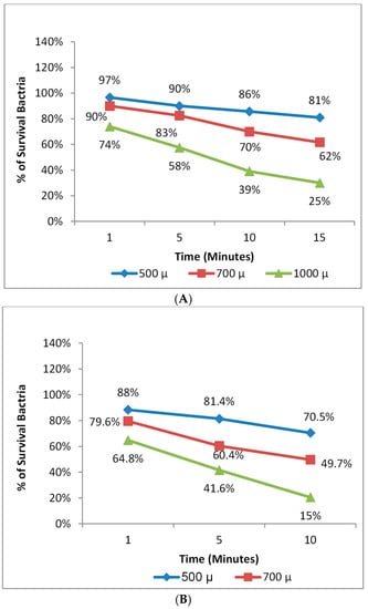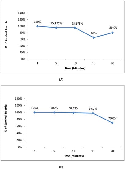 The results indicated that there was no significant light effect on the growth of S. aureus at 1 min. However, after 5 min, the bacterial survival percentage started to significantly decrease (p < 0.05), though, at 20 min, there was an increase in the bacterial survival percentage. In the case of E. coli, no significant light effect was observed on the bacterial survival percentage at 1 min or 5 min, but a significant decrease (p < 0.05) in the bacterial survival percentage was noted after 10 min, 15 min and 20 min (Figure 3).