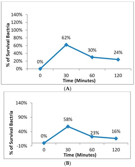 S. aureus was cultured on Tryptic Soy Agar-TSA, while E. coli was cultured on Luria-Bertani (LB) agar. Overnight cultures of S. aureus and E. coli were prepared by inoculating 10 mL of TSB and LB broth, respectively, followed by incubation at 37 °C. For the experiments, each culture was collected after serial dilution; S. aureus was diluted 1/10 (150 CFU/mL), while E. coli was diluted 1/100 (500 CFU/mL) due to its faster growth rate compared to S. aureus [].