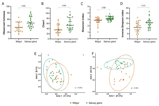 Alpha and beta diversity of bacterial communities from the midgut and salivary gland of field-captured Anopheles darlingi. The panel showed the (A) observed richness, (B) estimated richness by Chao 1, (C) diversity by Shannon index, and (D) inverse of Simpson index. Each point represents an analyzed sample. The bars show the median and 1st and 3rd quartile. The PCoA plots the distances between the samples estimated by unweighted Unifrac (E) and weighted Unifrac (F).