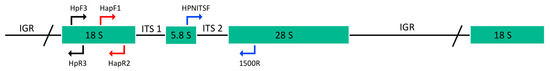 Three fragments of the ribosomal unit were amplified by PCR using different primer pairs. For the largest-sized amplicon, the primer HPNITSF, designed from the sequences obtained in this paper (see above) and located between the putative 5.8S rDNA and the ITS region, was paired with the primer 1500R to amplify a DNA region that includes the ITS and a partial 28S rDNA gene (Figure 2, Table 2). The primers HapF1/HapR2 and HpF3/HpR3 were used to amplify partial regions of the 18S rDNA gene (Figure 2, Table 2). The PCR reactions were carried out as described above in a Biometra PCR Thermocycler (Göttingen, Germany) and consisted of a pre-denaturation period for 2 min at 94 °C and 40 cycles of 94 °C for 30 s, 49–60 °C for 20 s and 72 °C for 30 s–1.20 min. Annealing temperature and extension time varied in relation to the primer pairs used and the expected size of amplification.