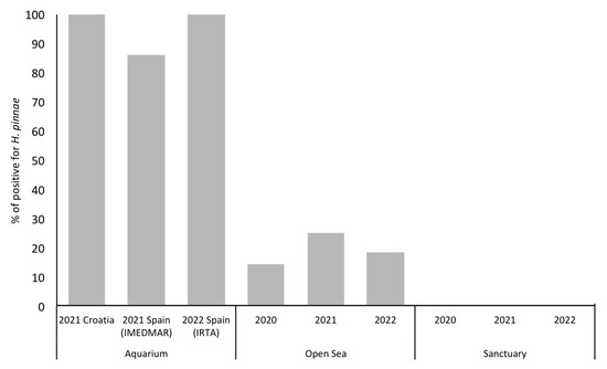 In our work, samples collected from controlled aquarium conditions both in Spain and Croatia showed the highest number of positive H. pinnae detections. This is probably due to a higher concentration of the pathogen compared to the open sea despite a lower amount of filtered seawater.