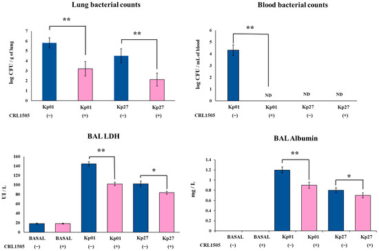 Effect of Lacticaseibacillus rhamnosus CRL1505 on lung colonization and damage induced by KPC-2-producing hypermucoviscous Klebsiella pneumoniae ST25 strains. BALB/c mice (6 weeks old) were orally treated with the CRL1505 strain for 5 days and then challenged nasally with K. pneumoniae LABACER 01 (Kp01) or LABACER 27 (Kp27). Before (basal) and two days after challenge, bacteria cell counts in lung homogenates, broncho–alveolar lavages (BAL) lactate dehydrogenase (LDH) activity and albumin concentration were determined. Results represent data from three independent experiments. Asterisks indicate significant differences between the indicated groups, (*) p < 0.05, (**) p < 0.01. Basal levels of BAL albumin were below the detection limit. ND: not detected. Pink bars represent mice given Lcb. rhamnosus CRL1505 and blue bars represent control mice.