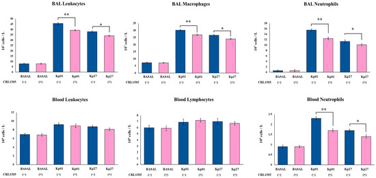 Effect of Lacticaseibacillus rhamnosus CRL1505 on respiratory and blood leukocytes numbers induced by KPC-2-producing hypermucoviscous Klebsiella pneumoniae ST25 strains. BALB/c mice (6 weeks old) were orally treated with the CRL1505 strain for 5 days and then challenged nasally with K. pneumoniae LABACER 01 (Kp01) or LABACER 27 (Kp27). Before (basal) and two days after challenge, total and differential leukocytes counts were determined in broncho–alveolar lavages (BAL) and blood. Results represent data from three independent experiments. Asterisks indicate significant differences between the indicated groups, (*) p < 0.05, (**) p < 0.01. Pink bars represent mice given Lcb. rhamnosus CRL1505 and blue bars represent control mice.