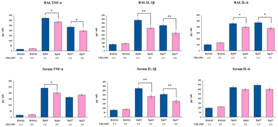 Effect of Lacticaseibacillus rhamnosus CRL1505 on respiratory and blood inflammatory cytokines induced by KPC-2-producing hypermucoviscous Klebsiella pneumoniae ST25 strains. BALB/c mice (6 weeks old) were orally treated with the CRL1505 strain for 5 days and then challenged nasally with K. pneumoniae LABACER 01 (Kp01) or LABACER 27 (Kp27). Before (basal) and two days after challenge, TNF-α, IL-1β and IL-6 levels were determined in broncho–alveolar lavages (BAL) and serum. Results represent data from three independent experiments. Asterisks indicate significant differences between the indicated groups, (*) p < 0.05, (**) p < 0.01. Pink bars represent mice given Lcb. rhamnosus CRL1505 and blue bars represent control mice.