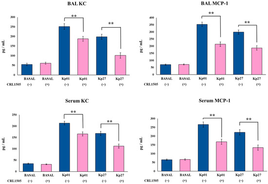 Effect of Lacticaseibacillus rhamnosus CRL1505 on respiratory and blood inflammatory chemokines induced by KPC-2-producing hypermucoviscous Klebsiella pneumoniae ST25 strains. BALB/c mice (6 weeks old) were orally treated with the CRL1505 strain for 5 days and then challenged nasally with K. pneumoniae LABACER 01 (Kp01) or LABACER 27 (Kp27). Before (basal) and two days after challenge, KC and MCP-1 levels were determined in broncho–alveolar lavages (BAL) and serum. Results represent data from three independent experiments. Asterisks indicate significant differences between the indicated groups, (**) p < 0.01. Pink bars represent mice given Lcb. rhamnosus CRL1505 and blue bars represent control mice.
