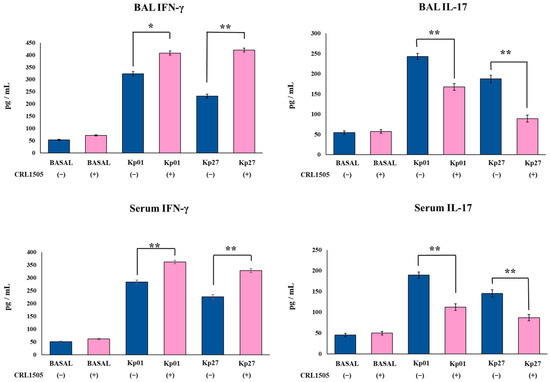 Effect of Lacticaseibacillus rhamnosus CRL1505 on respiratory and blood effector cytokines chemokines induced by KPC-2-producing hypermucoviscous Klebsiella pneumoniae ST25 strains. BALB/c mice (6 weeks old) were orally treated with the CRL1505 strain for 5 days and then challenged nasally with K. pneumoniae LABACER 01 (Kp01) or LABACER 27 (Kp27). Before (basal) and two days after challenge, IFN-γ and IL-17 levels were determined in broncho–alveolar lavages (BAL) and serum. Results represent data from three independent experiments. Asterisks indicate significant differences between the indicated groups, (*) p < 0.05, (**) p < 0.01. Pink bars represent mice given Lcb. rhamnosus CRL1505 and blue bars represent control mice.