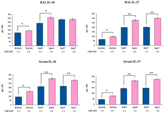 Effect of Lacticaseibacillus rhamnosus CRL1505 on respiratory and blood regulatory cytokines chemokines induced by KPC-2-producing hypermucoviscous Klebsiella pneumoniae ST25 strains. BALB/c mice (6 weeks old) were orally treated with the CRL1505 strain for 5 days and then challenged nasally with K. pneumoniae LABACER 01 (Kp01) or LABACER 27 (Kp27). Before (basal) and two days after challenge, IL-10 and IL-27 levels were determined in broncho–alveolar lavages (BAL) and serum. Results represent data from three independent experiments. Asterisks indicate significant differences between the indicated groups, (*) p < 0.05, (**) p < 0.01. Pink bars represent mice given Lcb. rhamnosus CRL1505 and blue bars represent control mice.