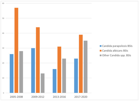 The case distributions of different Candida species that caused pediatric Candida bloodstream infections (BSIs) in the study period, 2005–2020, in Chang Gung Memorial Hospital.