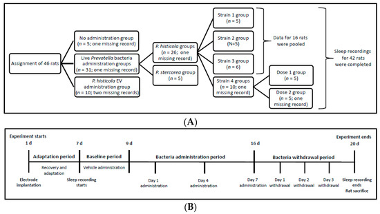 The Strain 1 and Strain 2 groups included five rats each; the Strain 3 group had six rats. We pooled the sleep recording data of the three strains for analysis. The Strain 4 group was divided into two additional subgroups, Dose 1 and Dose 2 groups, each comprising five rats, according to the quantity of bacteria administered. For the Prevotella groups, except for the Dose 1 group, each rat received 1010 CFU/day live bacteria during the 7-day administration period. The Dose 1 group received 106 CFU/rat/day over the same period.