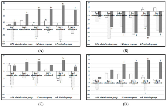 Figure 3 shows a 24 h cumulative latency time of the three groups. We observed no significant changes in the no administration and P. stercorea groups. In the P. histicola group, latency time decreased significantly on Day 1 of bacteria administration (mean time decrease: 17.4 min) and on Days 2 and 3 of bacteria withdrawal compared with that of the baseline (p < 0.05).
