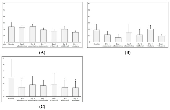 Cumulative latency time from the sleep–wake profile of rats administered with the human-gut-derived live Prevotella bacteria. p values (symbols * and † indicate <0.05 and <0.01, respectively) were derived from the Wilcoxon signed rank test in comparison to the baseline. (A) No administration group; (B) P. stercorea group; (C) P. histicola group.