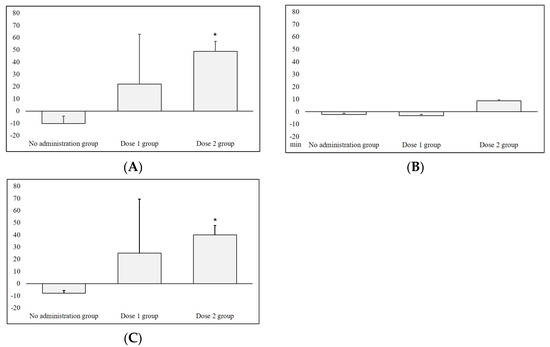 Based on the significant results in Figure 2 and Figure 3, we further evaluated the dose–response relationship for the P. histicola administration. For comparison with the no-administration group, we pooled the 3-day sleep–wake profile data analyzed during the bacteria administration period and calculated its differences with the baseline data. We observed an increasing trend in total sleep time for the three groups, such as none, 106 CFU, and 1010 CFU. In particular, the Dose2 group showed a significant increase (mean time increase: 48.7 min) compared with the no-administration group (p < 0.05, Figure 4A). Similarly, we observed an increasing trend in NREM sleep time across the groups; the Dose2 group had a significantly increased NREM sleep time (mean time increase: 40.1 min) compared with that of the no-administration group (p < 0.05, Figure 4C), but we found no significant differences in REM sleep time (Figure 4B).