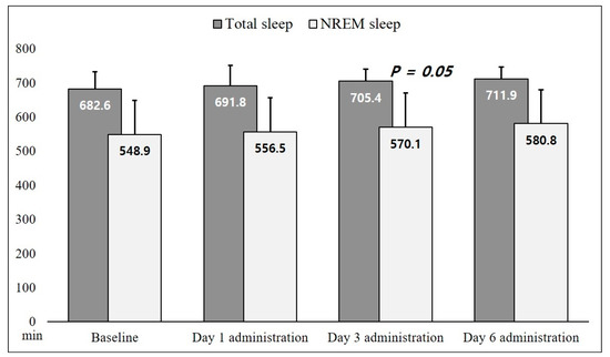 Figure 5 shows the effects of EV administration on sleep status. We observed an increasing trend in total sleep and NREM sleep time, with borderline significance on Day 3 of EV administration compared with that of the baseline (p = 0.05) in the NREM sleep data.