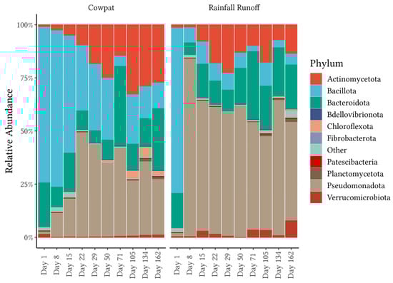 Relative abundance at the phylum level. Cowpat and rainfall runoff samples over time. Bars represent averaged replicates (n = 3) at each timepoint. Taxa not in the top 10 average abundances are shown as ‘Other’.