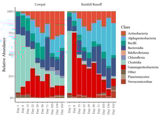 Relative abundance at the class level. Cowpat and rainfall runoff samples over time. Bars represent averaged replicates (n = 3) at each timepoint. Taxa not in the top 10 average abundances are shown as ‘Other’.