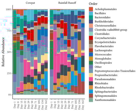 Relative abundance at the order level. Cowpat and rainfall runoff samples over time. Bars represent averaged replicates (n = 3) at each timepoint, and taxa with average abundances < 1% are shown as ‘Other’.