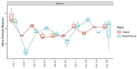 Analysis of individual replicates on each sampling day revealed low variability in diversity within the triplicate samples per treatment per sampling day (Figure 4). Overall, richness, measured by the Shannon alpha diversity index, was >4.2 for the cowpat and rainfall runoff matrices, with the highest diversity associated with fresh cowpats (Figure 4, Table 1). The exception was the rainfall runoff on Day 8, which had the lowest diversity. This shift in diversity coincided with the change in dominance from Bacillota in the rainfall runoff on Day 1 to Pseudomonodota (in particular, the Pseudomonadales) on Day 8 (Figure 1 and Figure 3).