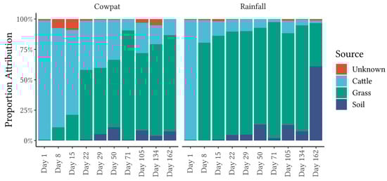 The sources of the microbes identified by 16S rRNA amplicon sequencing in the sinks of cowpats and rainfall runoff were analyzed using the FEAST algorithm. Fecal sources from cattle collected nationwide and the soil and grass collected from within the enclosure where the cowpat experiment was located were compared. The FEAST analysis of the cowpats and rainfall runoff at the order level can be viewed in Figure 5.