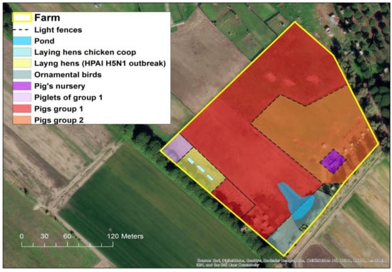 In fact, the rural farm did not have adequate biosecurity measures in place. In particular, the various breeding sectors (see Figure 1) were outdoors and separated only by light fences allowing direct contact among the different species. Additionally, the structural features of the farm did not present any obstacle for direct contact with potentially infected wild birds and their fecal droppings.