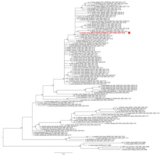 ML phylogenetic tree for the HA gene segment of H5NX avian influenza viruses from the 2.3.4.4b clade. The sequence of the virus causing the outbreak is highlighted in red and sided by a red star. The numbers at the nodes represent bootstrap values.