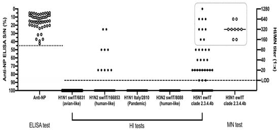 Serological screening of anti-NP ELISA positive pigs by HI and MN assays. The dotted line represents the threshold of S/N positivity of the ELISA test. The dashed line represents the limit of detection of the HI and MN tests. The dotted square highlights the samples tested by all of the HI, MN and NI tests against the H5N1 virus. Data are presented as individual and mean values for each type of analysis.
