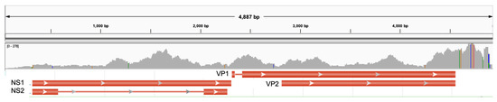 NC3 had the most reads that aligned to parvovirus. The 4921 bp canine parvovirus 2a (KY403998.1) genome is annotated (GenBank) and shown above the reads that aligned to this genome. This new strain was deposited into GenBank as MZ647470. The VP2 antigen is used to differentiate viral subtypes. NS = non-structural. Colored vertical lines on the gray coverage track represent single nucleotide variants compared with the reference.