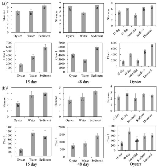 Diversity indices (mean ± SD) of (a) bacterial and (b) protist communities associated with oysters. 15 day: farmed oysters and their surrounding environmental samples obtained after 15 days of aquaculture. 48 day: samples obtained after 48 days of aquaculture. Oyster: farmed oysters after 15 days and 48 days, and diseased; and natural oysters in the intertidal zone and on the seafloor. Lower-case letters in the bars indicate significant differences analyzed by the statistical test.