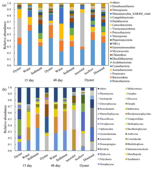 Relative abundance of (a) bacterial communities at phylum level and (b) protist communities at class level in the oysters and their surrounding environments. 15 day: farming oysters, water, and sediment samples obtained after 15 days of aquaculture. 48 day: samples obtained after 48 days of aquaculture. Oyster: farmed oysters when diseased, natural oysters in the intertidal zone and seafloor.