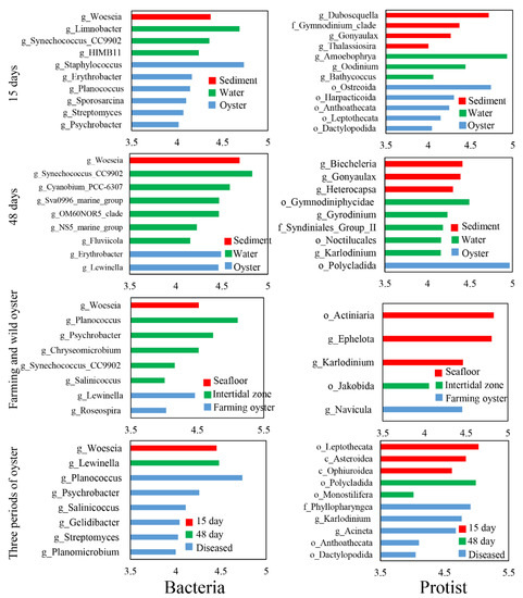 After 15 days of cultivation, biomarker taxa in the farming oysters were observed, including bacterial classes Bacilli and Actinobacteria, genera Erythrobacter and Planococcus, and protist classes Intramacronucleata, Bivalvia, and Hydrozoa, genera Karlodinium and Acineta (Figures S3 and S4). After 48 days of cultivation, bacterial class Alphaproteobacteria, genera Erythrobacter and Lewinella were the biomarker taxa in the oysters; protist classes Bacilllariophyceae, Bivalvia, Polychaeta, and Rhabditophora, genera Navicula were the most frequent specific species. Regarding the three periods of farmed oysters, particular biomarker taxa were found in the diseased oysters. For example, bacterial genera Woeseia was the only specific species observed in the diseased oysters; protist biomarker taxa were more diversified, including classes Gymnolaemata, Hydrozoa, Ophiuroidea, and Demospongiae, family Phyllopharyngea.