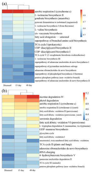 Heatmap of predicted functions investigated in (a) bacterial communities and (b) protist communities, based on the MetaCyc pathway database. Diseased: microbial communities in the diseased farmed oysters; 15 day: after 15 days in farmed oysters; 48 day: after 48 days in farmed oysters.