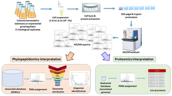 - Hartmann, E.M.; Allain, F.; Gaillard, J.C.; Pible, O.; Armengaud, J. Taking the shortcut for high-throughput shotgun proteomic analysis of bacteria. Methods Mol. Biol. 2014, 1197, 275–285. [Google Scholar] [CrossRef] [PubMed]