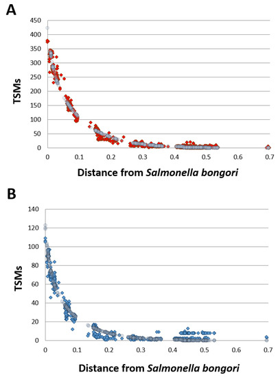 Phylopeptidomic signature of S. bongori harvested in exponential and stationary phases. Panel A: Exponential phase (replicate 1). Experimental TSMs (for each taxon present in the database) are indicated by red dots and the mathematical signature is represented by grey circles. Panel B: Stationary phase (replicate 1). Experimental TSMs (for each taxon present in the database) are indicated by blue dots and the mathematical signature is represented by grey circles. The calculated distance of each taxon present in the database (x axis) is indicated from Salmonella bongori. The phylogenetic distance is expressed as the ratio of differing residues between two taxa based on a multi-alignment of conserved COGs ubiquitous across superkingdoms and considering a total of 8310 amino acid positions as previously defined (Pible et al., 2020). A phylogenetic distance of 0.1 means that 10% of the 8310 amino acids are differing between the two taxa.