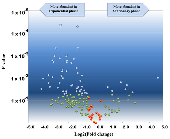 Volcano plot showing the comparative proteomics results of S. bongori stationary phase versus exponential phase. Tfold change was calculated taking into consideration the three biological replicates of both conditions. Proteins are indicated with blue circles if they satisfied both, the Tfold change (≥1.5 or ≤−1.5) and statistical criteria (p-value ≤ 0.05), orange circles for identifications that did not meet the fold criterion but have low p-values, green circles if they satisfied the fold criteria but, most likely, this happened by chance (p-value > 0.05), and red circles if they did not meet the fold and p-value criteria. The Benjamini–Hochberg test indicates that the FDR is less than 10% for this dataset.