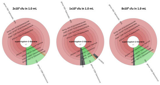 Krona presentation of the results of tandem mass spectrometry proteotyping. Identification results and biomass contributions of the three concentrations 2 × 105 cfu, 1 × 105 cfu, and 8 × 104 cfu are shown from left to right. The biomass contributions of S. bongori, D. proteolyticus, and the unassigned signal are shown in red, green, and grey.