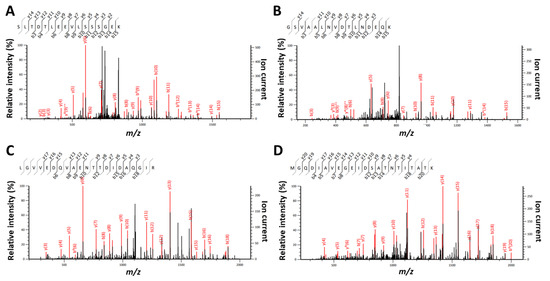 Representative MS/MS spectra and their MASCOT annotation for species-specific peptides. Panel A: MS/MS spectrum assigned to peptide SLTDTLEEVLSSSGEK (m/z 847.92169; z = 2; MASCOT score = 53.33) and specific of S. bongori species. Panel B: MS/MS spectrum attributed to peptide GSVAALNVDTLNDEQK (m/z 837.42096; z = 2; MASCOT score = 45.64) and specific of S. bongori species. Panel C: MS/MS spectrum #1669 (F404441 file) corresponding to peptide LGVVEDQVAENTTDIDAQGIR (m/z 1122.0614; z = 2; MASCOT score = 102.67) and specific of D. proteolyticus species. Panel D: MS/MS spectrum attributed to peptide MGQDIAVEGEIDSATNTITATK (m/z 1133.04687; z = 2; MASCOT score = 103.94) and specific of D. proteolyticus species. Ions indicated in red are those assigned and included in the MASCOT scoring.
