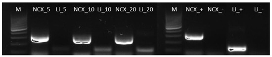Detection of kinetoplast Leishmania DNA in hair of wolves infected with L. infantum. M: molecular weight ladder. PCR for the NCX1 or L. infantum (Li) amplification with 5, 10 or 20 hairs. In addition, positive (NCX_+ and Li_+) and negative (NCX_− and Li_−) controls were included in the reaction.